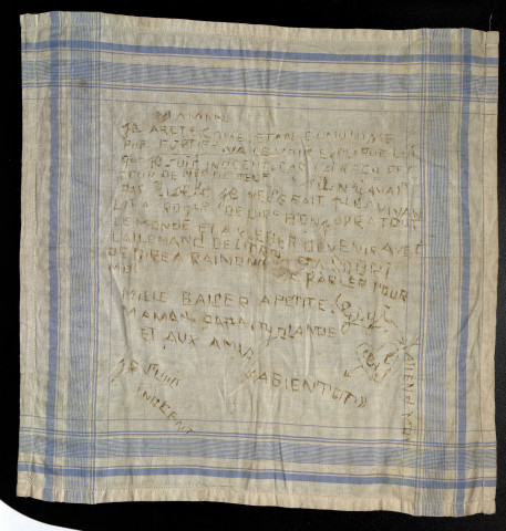 Présentation du mouchoir de Colbert Marie par sa famille lors de la cérémonie à la maison d'arrêt de Caen le 6 juin 2023. A l’issue de la cérémonie, la famille de Colbert Marie, fusillé alors qu’il n’avait que 17 ans, est venue aux Archives du Calvados sur les conseils de madame Valérie Rapeaud, Directrice des Relations Publiques et du Protocole de la Ville de Caen et de monsieur Gérard Fournier, Président de l’association Mémoires de la Résistance et de la Déportation Normandes. La famille a en effet choisi de nous faire don du mouchoir sur lequel Colbert Marie a écrit un message avec son sang à sa mère durant sa captivité à la maison d’arrêt de Caen.