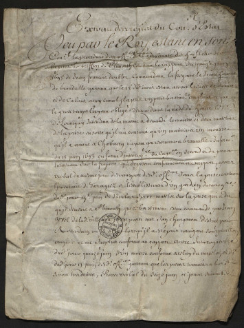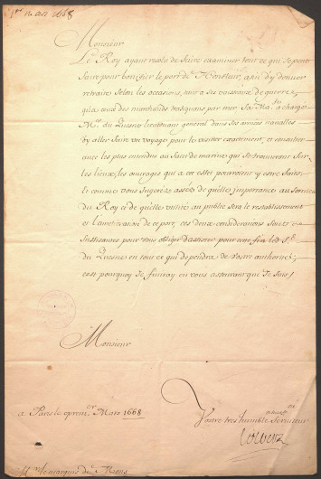 Lettre de Colbert indiquant la venue au nom du roi de M. Duquesne, lieutenant général de la marine, pour identifier les ouvrages à effectuer pour améliorer le port de Honfleur, 1er mars 1668. AD14, AA/47.