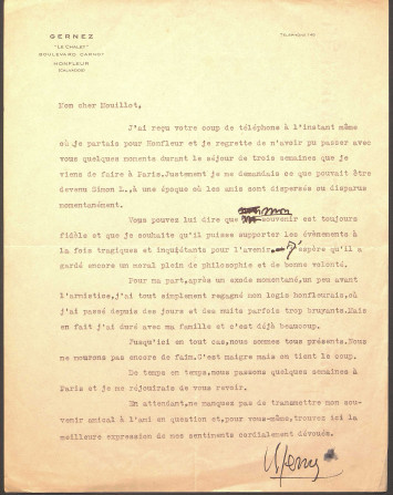Lettre de l'artiste Paul-Elie Gernez évoquant les difficultés de la vie durant l'Occupation à Honfleur, 1940. AD14, 6J/19/2.