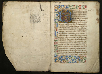 Ce folio est enluminé. L'enluminure sur la lettre B initiale représente plusieurs personnages.