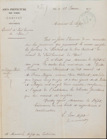 Lette du sous-préfet de Vire au préfet du Calvados conseillant le maintien dans leurs fonctions des actuels président et vice-président du conseil des prud’hommes de Vire, 12 février 1877. AD14, 1U/1/1