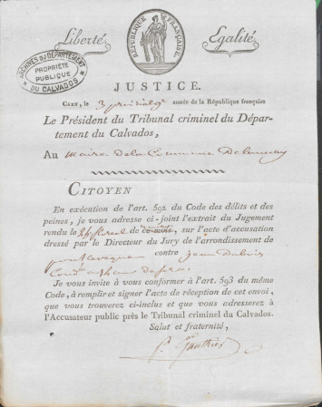 Pièce du dossier de procédure à l’encontre de Jean Dubois jugé par le Tribunal criminel du département du Calvados, 3 prairial an 9 (1801). AD14, 7U/1/5